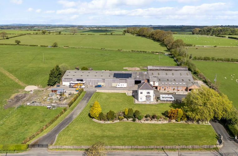 The farm is accessed via a gated entrance leading to a side driveway and a large courtyard with extensive hardstanding. There is an impressive range of modern steel and block-built agricultural buildings extending to approximately 20,000 square feet, constructed in 2014, together with a brick-built double garage featuring roller shutter doors.