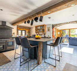 Approached via a private sweeping driveway, the property combines the charm of traditional architecture with the convenience of modern living. Thoughtfully restored by the current owners, the house retains a wealth of original features, including exposed beams and stonework, complemented by contemporary finishes throughout.