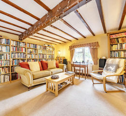 Snug with woodburning stove in grate, beamed ceiling, wall lights