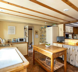 The kitchen seamlessly flows into the charming dining room, which boasts an open fireplace, exposed beams, wooden flooring, creating a warm and inviting space for family gatherings.