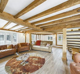 The lounge in the original part of the property dates back to the 16th Century, has exposed restored beams, a woodburner and stairs which lead up to two generous sized bedrooms, walk-in wardrobe, a mezzanine floor with picturesque views over the Colne Valley and an en-suite bathroom with walk-in shower, a freestanding slipper bath with chrome taps, two chrome heated towel rails and a vanity unit with stylish wash hand basin and WC with Quartz top.