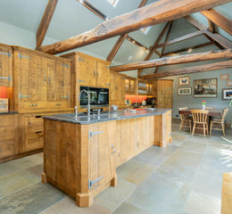 The entrance hall offers three different directions to explore the home further, but turning left into the kitchen/dining space is the natural turn to take. This vaulted room was an unconverted barn when the owners moved in, but is now the perfect entertaining space. The bespoke, handmade oak kitchen was purposely distressed to tie in with the exposed cross beams, and industrial ironmongery was selected as a subtle nod to this home’s previous life as a working building.