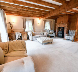 Interior - The original reception hall, while no longer used as the main entrance, leads to a more practical rear lobby with direct access to the utility/boot room. Adjacent to the utility room is a home office, ideal for those with flexible work-from-home arrangements. The farmhouse kitchen is well-equipped with base and wall-mounted units, solid marble countertops, and features an Aga for hot water and cooking, supplemented by an electric induction hob and oven. Additional kitchen amenities include a fridge freezer, dishwasher, limestone effect flooring, beamed ceilings, and a walk-in pantry. A distinctive feature is an exposed well with a glazed cover. The dining room showcases a brick fireplace and beamed ceilings. A reception room off the hall, with its own fireplace and beamed ceilings, can extend the hall space, leading to a rear lobby with a guest cloakroom. Double doors open into an impressive 'L' shaped drawing room with a feature fireplace and beamed ceiling, perfect for entertaining.