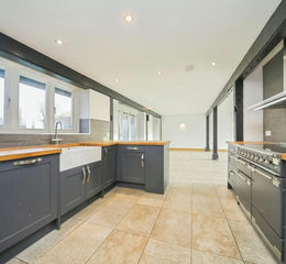 The kitchen has been thoughtfully designed with high-quality cabinetry, a Rangemaster cooker and integrated appliances, complemented by a separate utility room that discreetly supports day-to-day living.
