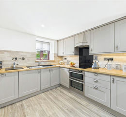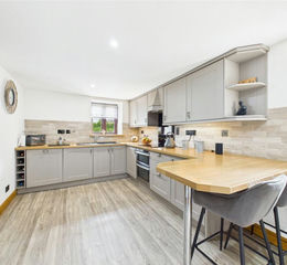 A modern fitted kitchen comprising a range of wall and base mounted units with work surfaces over, incorporating a composite sink drainer unit with mixer tap and 4 ring hob with extractor. Built in electric oven and grill. Space and plumbing for dishwasher and washing machine. Breakfast bar. Window to front and rear elevations.