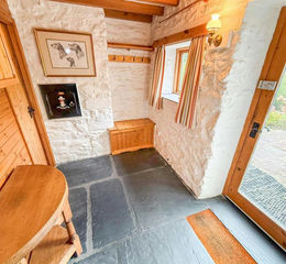 The Hallway - The hallway has a slate flagged floor, glazed door to the front and a window to the front. With wall lights, beamed ceiling and exposed brickwork. Doors lead to the dining room and the bathroom.