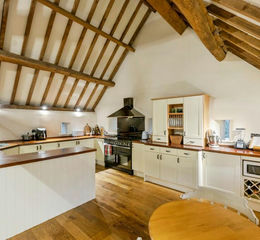 A large spacious area divided by an open timber frame and steps into the living area, with spacious exposed timbers to the open roof void and complimentary oak flooring. The kitchen area has a extensive range of wall and base units with varnished work surfaces and open shelving plate racks, there is two central heating radiators and period decorative features continuing from the living area. The room hosts space for a electric range master cooker with extractor hood above, there is space for a fridge and freezer, plumbing for a washing machine and three single glazed windows providing an abundance of natural light.