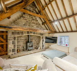 With exposed rafters and perlins to the open ceiling, theres an exposed stone fireplace to the focal point of the room, contrasting wall lights and front and side facing single glazed windows.