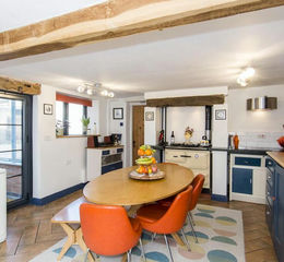 Kitchen/Diner - 5.38m x 4.11m (17'8" x 13'6") - The heart of the home this wonderful dining kitchen is fitted with bespoke hand painted cabinets with a combination of granite and solid oak work surfaces. A retro Paul Argyle stainless steel sink unit with mixer taps. Induction hob and extractor fan. A brick Inglenook with oak beam over houses the Rayburn cooker. There is a space for a fridge freezer and ample room for a dining table . Column radiator and ceramic tiled flooring. Two double-glazed windows to the side aspect and a sliding door opens into the utility. An aluminum door opens into the porch and boot room.