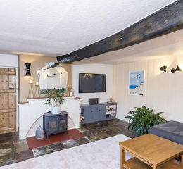 Sitting Room - 4.57m x 4.45m (15' x 14'7") - The cosy sitting room has a feature stone fireplace housing a wood burning stove. Timber beam to the ceiling. Double-glazed window to the side aspect. Limestone flooring and a radiator.