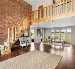 The journey begins in the impressive dining hall, where a double-height vaulted ceiling and glazed atrium create a dramatic sense of volume, evoking the character of a traditional barn driftway. A handcrafted staircase rises to a galleried balcony, setting the tone for the remarkable living spaces that follow.