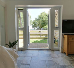 The living and dining areas, with vaulted ceilings and French doors to the garden, offer an inviting space for relaxed evenings or entertaining. A luxurious bathroom with roll-top bath and separate shower provides a private sanctuary, while a few steps down reveal two tranquil bedrooms. The principal room features a curved wall, fitted wardrobes, and panoramic views across open fields, while the second bedroom is perfect as a guest retreat or home office.