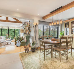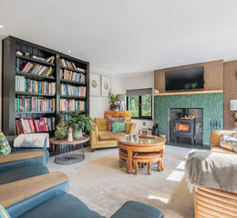 The main living space is particularly special. Airy and inviting, it centres around a beautiful fireplace full of character, which is flanked by a built-in bookshelf. From here, the open plan room flows into the garden room - a showstopper with high, beamed ceilings and walls of glass that open onto the peaceful gardens. It's a room for every season and every time of day: peaceful in the morning, radiant by afternoon, and atmospheric as evening falls.