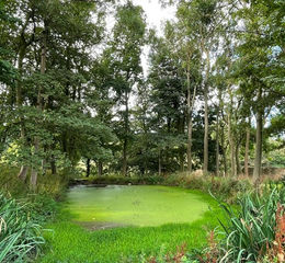 To the west of the drive is an area of woodland with a pond and a walled garden with wrought iron decorative gates.