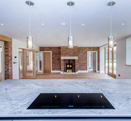 On the ground floor impressive reception hall with magnificent window to the front and 26 foot high vaulted ceiling with oak staircase and glass balustrade leading to a gallery landing. Principal reception rooms are all of exceptional proportions, including a family room with three large windows and snooker table included, a room that could be split into two having two approach doors from the hallway already in situ. A separate dining room with feature exposed brick wall, and French doors to the outside patio and garden. Lounge with dual aspect to south and west with French doors to patio, exposed brick wall and wood-burning stove. A 32 foot living dining kitchen with French doors to rear garden and patio for outdoor entertaining and alfresco dining is the hub of the house and features range of fitted cupboards and island bar with integrated appliances, including tall fridge and separate freezer Miele twin ovens, two plate warmers, microwave, two Miele dishwashers, wine cooler hob and extractor above. There is also feature exposed brick wall and wood-burning stove to the seating area. A separate utility room and walk in pantry, downstairs cloak room with WC home office and plant room with central heating boiler, hot water storage tank and controls from the underfloor heating, alarm and CCTV completes the ground floor.