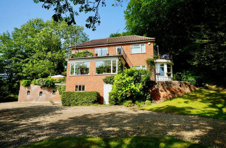 An impressive detached home of original design, set within approximately 1.5 acres (STMS) of beautifully landscaped gardens and mature woodland. Perfectly positioned in an Area of Outstanding Natural Beauty, this wonderful home enjoys stunning panoramic views over rolling countryside. Extending to over 2,200 sq. ft. of accommodation across three levels, the property is immaculately presented and filled with natural light. The main living spaces are on the ground floor and make the most of the setting, enjoying wonderful views, and include a formal drawing room/dining room with a semi-circular dining area, a bright living room with doors to a raised terrace, a wonderful sunroom, well-appointed kitchen, utility room, and ground floor bathroom.