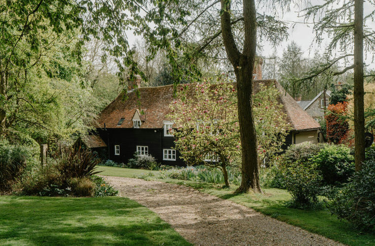 The house's timber-framed 19th-century façade is lined with blackened weatherboards. New windows punctuate its profile, which is crowned by a hipped-tile roof and a small gable dormer crowns. Set beneath an oak-framed porch, the front door opens to a limestone and brick-laid hall and study area.