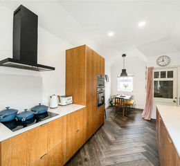 There is a useful and practical entrance porch, leading into the kitchen with dining area and this offers a welcoming and warm feel to the house. There are two reception areas, offering flexible and attractive space and an inviting feel, where the entertaining scope can be fully maximised. The striking, contemporary kitchen has an excellent range of storage units, with ample space for dining, the triple aspect lets natural light fill the room and views onto the garden can be enjoyed. Integrated appliances include the oven, induction hob, grill and extractor fan. The high ceilings and quartz worksurfaces add refined touches.