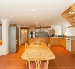 From the moment you step inside, you are greeted by an impressive open-plan living area with soaring vaulted ceilings and exposed beams, creating a sense of space and grandeur. The open-plan design effortlessly combines the lounge, dining, and kitchen areas; ideal for entertaining or family life. An abundance of natural light pours through large windows and glazed doors that frame the surrounding views.