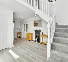 Composite entrance door with glazed inset and side screen opens into a spacious hallway. Feature cast iron fireplace, stairs to first floor with under-stair cupboard, large storage cupboard, double radiator, coving, and thermostat.