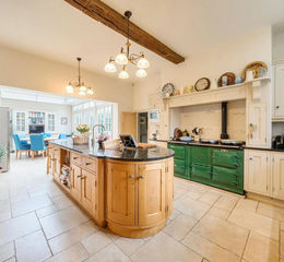 Main House - Accommodation - A solid wood front door with glazed panel above leads into a welcoming entrance hall, setting the tone for the house with an original staircase, ceiling coving and rose, and attractive flagstone flooring. A door leads to the cellar. The elegant dining room offers an original sash window with shutters to the front, ceiling coving and rose, a marble fireplace with gas fire and full-height original cupboards on either side. The sitting room also has an original sash window with shutters, ornate ceiling features, a fireplace with open fire and bi-fold doors opening into the garden room, a wonderful, light-filled space with French doors and windows overlooking the gardens, a built-in dresser, tiled flooring with underfloor heating, and open-plan access to the impressive breakfast kitchen.