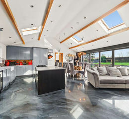 Immediately upon entering the grandeur and style is apparent. The stunning bespoke epoxy polished resin flooring is a beautiful eye-catching feature and flows throughout the main rooms, The living dining kitchen perfectly lends itself to family get-togethers and more formal dining alike, fitted with stylish cabinets including integrated appliances and granite tops, there is space for a large dining table as well as a lounge area in front of a contemporary fireplace which creates a cosy ambiance, the bank of bifold doors flood the room with natural light and sweep open to allow entertaining to spill outdoors. Three reception rooms provide family versatility, the sitting room with wood burning stove and neutral décor is a relaxing space and again boasts Bi-fold doors that open out to the garden, this room is particularly relaxing, and although part of the main home could also be utilised as an annex area for a dependant relative as the inner hallway then leads to a bedroom and 4 piece ensuite bathroom with a walk-in dressing room that could be converted into a kitchen. The family room is currently a games area having doors that open into the beautiful indulgent lounge that really does provide that "Wow Factor" with a high beamed ceiling a glass and oak galleried viewing landing, an exposed stone wall meets a panelled feature wall with bespoke glass panes fitted around an oculus window, there is a large exposed brick feature chimney breast that houses a contemporary fire which creates an inviting atmosphere. In total, the property has 7 bedrooms, three of which are located on the ground floor two have ensuite facilities whilst there are four bedrooms to the first floor the master bedroom has a cathedral-style beamed ceiling, stylish décor and is served by a modern shower room. The house bathroom comprises a free-standing bath, a large walk-in shower vanity-style sink, and a low-level WC.