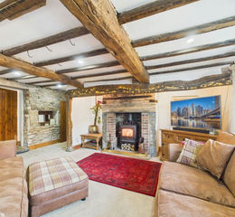 Hardwood double glazed windows to side elevations, exposed oak beams and oak timber frames, original feature hooks in ceiling beams, feature brick and stone fireplace with stone lintels, alcoves with downlights, feature stone wall with inset shelving (original windows), exposed beamed arch leading to dining room.