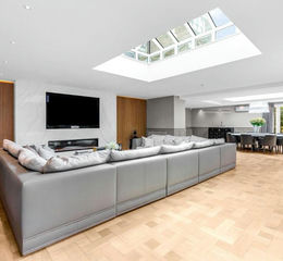 At the heart of the home lies an outstanding kitchen and breakfast room, expertly designed for both family life and entertaining on a grand scale. This bespoke space is fully equipped with an extensive range of integrated Gaggenau appliances, including multiple ovens, steam and rotisserie functions, gas and electric hobs, a Teppanyaki hot plate, four fridges and two dishwashers. Two substantial central islands provide generous preparation and seating areas, while French doors open directly onto the sun terrace and swimming pool. Flowing seamlessly from the kitchen, the family room is flooded with natural light through its triple aspect windows, offering panoramic views across the landscaped gardens.