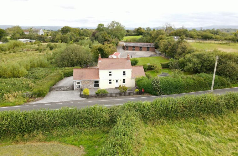 The property is approached off the highway via timber gated entrances, along a gravel driveway lane leading into the property with ample parking area for multiple vehicles to the rear and side on gravel and concreted areas, whilst the access lane continues through to the double garage, stable block and land to the rear.