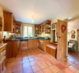 BREAKFAST AREA:: 3.03m x 4.28m (9'11" x 14'1"), Picture window to front. Recess with inset two oven Aga with bespoke cabinets with drawers and cupboards set on each side and wooden mantel over. Opposite are full height fully shelved cupboards with sliding panelled doors at high and low level. Matching pine wall units at eye level with under lighting. Set in the corner is a bespoke pine settle with storage under seat. Recess with serving hatch. Door into fully shelved pantry. From kitchen down steps to:
