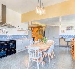 The farmhouse itself has been thoughtfully refurbished and extended over the years to create a welcoming and versatile living space. The heart of the home is a spacious and well-equipped kitchen, featuring modern fitted units, space for a range cooker, and a large larder cupboard and an integral dishwasher. The adjoining snug, complete with a solid fuel Rayburn range, offers a warm and characterful space. The dining room retains its period charm with a stone fireplace housing a multi-fuel stove and exposed ceiling beams could also be used as a bedroom.