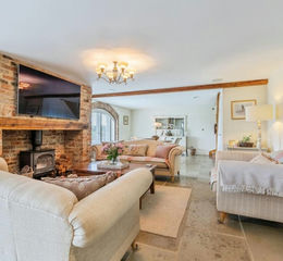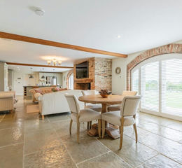 Open plan kitchen, dining, and living area in the heart of the home with underfloor heating and Sonus sound system throughout. The kitchen features a large central island with a built in wine rack, breakfast bar seating, and a classic Belfast sink. All complemented by integrated appliances including a dishwasher, washing machine, and a large oven with hob and extractor fan. A freestanding fridge/freezer completes the setup. Exposed brickwork add character, while the arched French doors flood the space with natural light and connect seamlessly to the outdoors. The living area boasts charming rustic beams, a statement exposed brick fireplace with a log burner, and elegant stone flooring throughout. Flowing effortless to the dining area featuring another arched brickwork framing the full height windows and French doors, creating a striking blend of character and light.