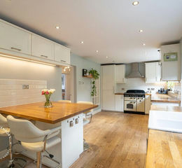 The study provides an adaptable area with double patio doors opening directly to the gardens, ideal for home working or quiet retreat. At the heart of the home lies the recently refitted breakfast kitchen, complete with lightwood-effect cabinetry, integrated appliances, and a stable door leading outside. A separate family room offers further relaxation space, where a freestanding solid-fuel burner and exposed ceiling timbers add warmth and character, while also providing access to the garden. Practical touches include a utility room with Belfast sink, tiled flooring, and excellent storage, alongside a guest cloakroom with WC.