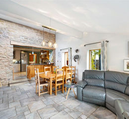 The practical kitchen, complete with granite work surfaces, opens into a versatile living/dining area, flowing seamlessly into a characterful living room with a log burner – perfect for cosy evenings. A useful utility room and downstairs WC add everyday convenience. Upstairs, there are three generous bedrooms, including a master suite with fitted wardrobes and an ensuite shower room. A well-appointed family bathroom and skylights throughout provide excellent natural light and a sense of openness.