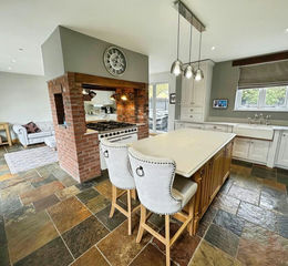 8.36m x 5.51m (27' 5" x 18' 1") - , PVCu double glazed windows overlooking the front and rear with fitted roller blinds, mirrored splash back, continuation of the flagstone tiled flooring. A range of bespoke wall and base units in ivory with solid granite work surfaces. Double inset Belfast sink with chrome mixer tap and boil tap. Integrated appliances include dishwasher and under counter fridge. American style fridge/freezer to remain. Falcon Range cooker with five ring gas hob and double oven to remain set within floor to ceiling feature brick chimney central to the room.