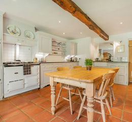 The heart of the home lies to the left of the entrance hall, in the kitchen, where the rusticity of the treacle-toned beam overhead is counterbalanced in contemporary fashion by inset spotlighting, to create a bright, amply illuminated space. Cook a Sunday roast in the country-style Aga and gather for dinner around the farmhouse dining table.