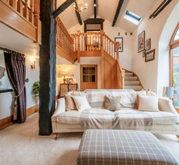 The large sitting room is the dramatic heart of Deerwood Barn, a wonderfully atmospheric space where country living takes on a sense of quiet grandeur. A soaring double height ceiling, exposed beams and a handsome brick chimney breast with inset log burner create a focal point that feels equally suited to relaxed Sunday afternoons as it does to winter gatherings by the fire. Full height arched glazing frames the garden beyond, drawing in soft natural light by day and giving the room a lantern like glow after dusk. From here, the gallery landing above offers a charming vantage point, adding a touch of theatre to the room and reinforcing the sense of volume and airiness at the centre of the home. This room is located just off the kitchen so would also make a wonderful formal dining room to entertain guests.