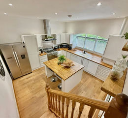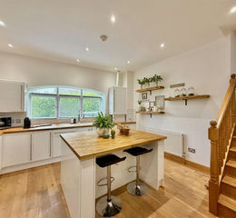 Kitchen/Breakfast Room - 4.37m x 4.17m (14'4 x 13'8) - A superb room fitted with matching cabinets and feature island with a breakfast bar, complemented by polished hard wood work surfaces. Inset one-&-a-half bowl sink unit. Space for Range-style cooker with a cooker hood above. Space for an American-style fridge-freezer. Built-in dishwasher. Integral washing machine. Larder cupboard. Wall-mounted Glow worm gas boiler concealed by a matching cabinet. Feature exposed floor boards. Inset ceiling spotlights. Window with fitted blind to the rear elevation.