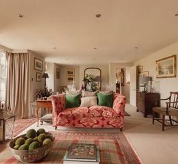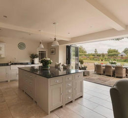 Internally, the house unfolds with quiet sophistication. The entrance hall offers a warm and practical welcome, with boot room and utility areas positioned discreetly to one side. Beyond, the principal kitchen and dining room is arranged to take full advantage of the surrounding gardens, with wide bifolding doors opening directly onto a stone terrace. Bespoke Neptune cabinetry, granite worktops and a central island frame the space, with an electric AGA and Rangemaster wine fridge integrated into the traditional layout. There is ample room for both formal and informal seating, creating a sociable and light-filled setting that connects beautifully with the outdoor spaces.