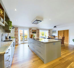 Kitchen/Dining Room - 6.86m x 5.89m (22'6 x 19'4) - Modern kitchen fitted with a range of wall, base, and drawer units with oak shaker style doors and granite work surfaces over and matching central kitchen island. The island features a five ring 'NEFF' induction hob with extractor mounted on the ceiling above, as well as a granite overhang providing a breakfast bar. 1 1/2 bowl stainless steel sink inset in granite worksurface with integrated drainer and mixer tap and granite splashback. Twin integral eye level ovens with warming drawers. Two integral dishwashers. Two vertical flat panel radiators. Consumer unit. Integrated larder fridge and tall freezer. Large walk in bay window providing views of the rear garden.