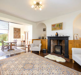 The main entrance leads directly into the first of five reception rooms, a space that sets an elegant scene, as it carries an inglenook fireplace with a log-burning stove, a hardwood floor, original multi-pane windows and working internal wooden shutters.