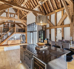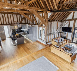 A superb grade II listed barn conversion occupying a wonderful plot in the sought after hamlet of Langley. Set behind gates, Haybarn is presented in stunning condition throughout and offers a seamless blend of modern contemporary living along with exposed wooden beams, vaulted ceilings, and period features adding to the property's unique character. The ground floor features wonderful open plan living with fabulous vaulted ceiling wood burner, fitted kitchen with central island and spacious living area. The ground floor also houses three of the barn’s bedrooms, one with its own en-suite as well as a separate shower room. The first floor enjoys a mezzanine space overlooking the ground floor and is currently being used as an office space and door to the principle suite, which is arranged over two floors and enjoys its own dressing area with fitted wardrobes and en-suite.