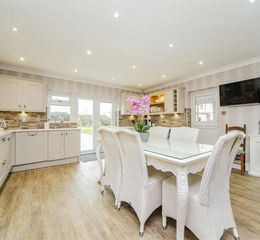 Inside, a grand entrance hall sets the tone for the generous proportions and refined interiors. At the heart of the home is a stunning open-plan kitchen, dining, and living area, perfect for both day-to-day living and entertaining. The contemporary kitchen features sleek white worktops, neutral-toned cabinetry, integrated appliances, and excellent storage. The dining area opens onto the rear garden via floor-to-ceiling doors, creating a seamless flow for indoor-outdoor living.