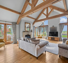 The heart of the home will undoubtedly be the stunning dining kitchen with a part vaulted ceiling and windows to three elevations which is beautifully appointed, being fitted with a bespoke handcrafted range of units by Loxleys to incorporate both traditional and contemporary elements. The kitchen is fitted with high quality integrated appliances including a sub zero fridge freezer and wine cooler and Miele oven and hob complemented with a traditional style electric Aga range. This room offers wonderful views into the garden, linking out onto a south to westerly facing terrace with views across the garden. The main sitting is again a truly superb space with exposed oak timbers and a high vaulted ceiling with king post and truss, a glazed gable end and wonderful views down the property's own gardens and fields beyond.