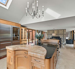 Dining Kitchen - 8.43m x 5.61m (27'8" x 18'5") - A particularly impressive space which will undoubtedly become the hub of the home, benefitting from windows to three elevations and includes a part vaulted ceiling with inset sky lights providing a wonderful, light and airy space the focal point of which is the double sized chimney breast with inset contemporary stove. The kitchen is beautifully appointed with a handcrafted Loxley kitchen comprising a considerable range of bespoke units with glazed display cabinets and a central island unit with granite preparation surfaces providing a fantastic working area; an additional breakfast bar with integrated wine cooler; further appliances including Miele fan assisted oven and induction hob, Aga electric range, dishwasher, sub zero fridge freezer and integrated wine cooler; undermounted stainless steel twin bowel sink with brush metal swan neck Franke mixer tap; continuation of the tiled floor; bifold doors leading out onto the terrace and two further windows to the rear and side elevations.