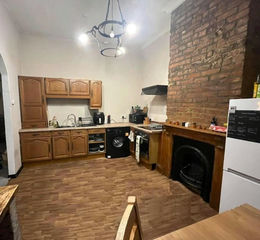 With wood effect linoleum tiled floor, wall and floor fitted kitchen units with inset stainless steel sink unit, integrated oven and hob, Victorian fireplace and plumbing for automatic washing machine.
