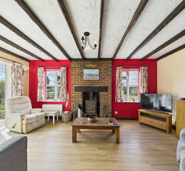 Living Kitchen - a spacious ‘L’ shaped room. The living/dining area has windows to three aspects including French doors to the rear gardens. There is also a further window in the kitchen area and an exposed brick fireplace with a cast iron solid fuel burning stove. The kitchen has a range of base and wall mounted units arranged around a gas fired Rayburn which also provides the central heating. There is a slate style floor and a sink and drainer.