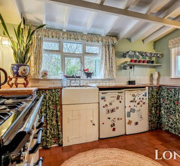 Hand made shelving units with worksurface over, enamel butler style sink with mixer tap and drainer, large Range style gas cooker with extractor hood over, built in pantry, double glazed windows to front and side.