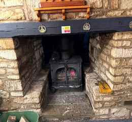 Seats around 12 with beamed ceiling and Cotswold stone wall surrounding a stunning huge coal affect gas fire surrounded by a Cotswold stone inglenook.