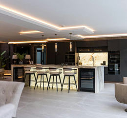 As you step inside, through a beautifully constructed anthracite grey, aluminium oversized entrance door with side lights you are immediately greeted by a breath taking open-plan reception area featuring a bespoke floating walnut and steel staircase and a custom made Venetian 'burnt look' centrally framed bioethanol fireplace, a stunning focal point of the room! There is a stylish bar area with feature glass display wall, luxury polished floor tiles and RAKO intelligent LED lighting system. The floor-to-ceiling glass doors which span across the back of the room offer breath-taking views extending over the rear garden. The exquisite high specification kitchen is fully fitted with an extensive range of seamless wood effect and dark cabinets, incorporating two sinks, an abundance of integrated, top of the range appliances, including two double ovens, dishwasher, wine coolers, induction hob and Quooker hot water tap. Featuring stunning, illuminated marble worksurfaces which also extend to the island where the marble has been book matched to create a perfect mirror image with waterfall edge. From here a large glazed aluminium door takes you through to a side-link, which is perfectly aligned and provides access into the state of the art 'showroom' style garages with diffused light troughs, wall incorporated LED strip lighting, custom cushion wall panelling with 'Marble' look epoxy resin flooring. There is a formal living room with feature log burner, stone hearth and mantle piece, bespoke mirrored walls, custom upholstered wall panels and an audio video wall which offers state of the art acoustics, aesthetics and a luxurious feel. The ground floor also accommodates a utility room, guest WC and boot room. The property boasts stunning, internal 'walnut' doors, water fed underfloor heating system to all tiled areas across the ground floor including the side link to the garage.